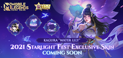 Skin ini diberi emblem STAR karena skin ini hanya direlease pada 1 tahun sekali, Kagura diberikan skin ini pada tahun 2021 ini dengan nama Waterlily. Skin ini didapatkan dengan cara meng - Spin pada event Starlight fest yang ada di shop dan mengumpulkan badge sebanyak 400 buah, menurut review dari beberapa youtuber skin ini bisa didapatkan dari 2500 hingga 4000 diamond saja loh!. Walaupun sedikit mahal akan tetapi para pengagum Hero Kagura dan para gamers Hardcore Mobile Legends akan berani untuk mendapatkan Skin WaterLily ini yang mungkin tidak akan didapatkan lagi pada event selanjutnya.